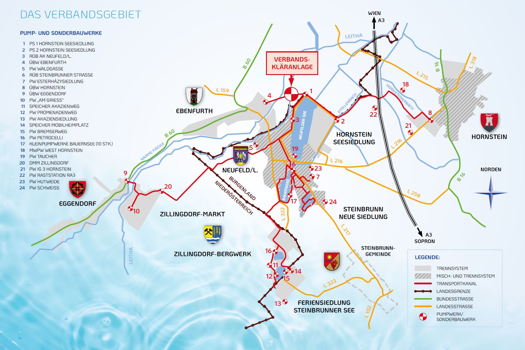 Vor mehr als 40 Jahren, im März 1976 wurde der Abwasserverband Neufelderseen-Gebiet gegründet, der mittlerweile aus 7 Mitgliedern besteht (6 Mitgliedsgemeinden und der Esterhàzy Domänen Privatstiftung). Das Abwasser von ca. 20.000 Einwohner (im Sommer durch den Fremdenverkehr wesentlich mehr!) wird durch die Verbandskläranlage gereinigt. Die Mitgliedsgemeinden sind durch insgesamt rund 24 km Transportkanal verbunden, die in der Betreuung des Verbandes stehen. Die Ortsnetze, die im Zuständigkeitsbereich der jeweiligen Gemeinden sind, sind infolge der Ausdehnung der Siedlungsgebiete in den einzelnen Gemeinden stetig steigend. Zum Abwassersystem, das der Verband betreut, gehören zusätzlich 28 Pumpwerke, 3 Regenrückhalteanlagen und 5 Mischwasserspeicher mit Mischwasserentlastungen, die über das gesamte Verbandsgebiet verteilt sind. Überregionalität erreicht der Wasserverband Neufelderseen-Gebiet durch die angeschlossenen Gemeinden Hornstein, Neufeld a. d. Leitha und Steinbrunn aus dem Bezirk Eisenstadt-Umgebung auf burgenländischer Seite und den Gemeinden Ebenfurth, Eggendorf und Zillingdorf aus dem Bezirk Wr. Neustadt auf niederösterreichischer Seite.