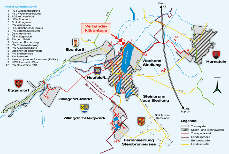 Der Wasserverband Neufelderseen-Gebiet ist – wie Sie im im Bereich „Über uns“ lesen können – ein interkommunaler und bundesländerübergreifender Zusammenschluss der Gemeinden Ebenfurth, Eggendorf, Hornstein, Neufeld/L., Steinbrunn und Zillingdorf, sowie der Esterhazy Betriebe als Inhaber der Feriensiedlungen in obigen Gemeindegebieten, und ist durch den Betrieb der zentralen Kläranlage für das REINIGEN DER ABWÄSSER DER MITGLIEDER zuständig.